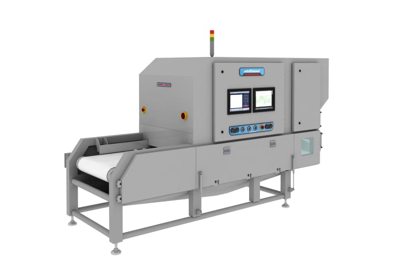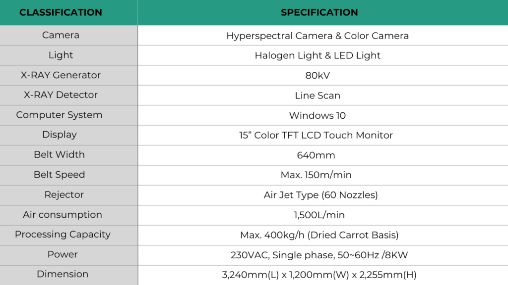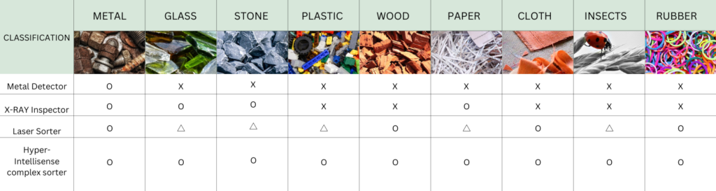 A super advanced device combines HYPER-INTELLISENSE®, X-ray, and Vision technologies. This allows it to find and sort out light and heavy foreign objects in food and farming stuff all at once.